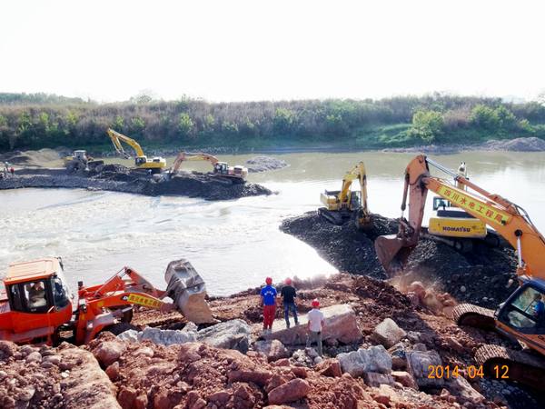 正午時分,整個工地機械轟鳴,6臺挖掘機、4臺裝載機、6輛20t自卸汽車往來穿梭,抓緊進行圍堰填筑。隨著兩岸戧堤的逐步進占,河道由寬變窄,最后形成一個寬約3米的龍口,往日平靜的涪江現在卻白浪翻滾,咆哮著奔出龍口。由于上游電站泄洪,導致河水水位陡增,用于截流的大塊石瞬間被沖出裹頭,最后3米的龍口始終無法合龍。面對前期準備的截流材料用盡,現場附近又沒有大塊石材的急情,四處領導果斷采取措施,命令截流施工人員將鋼橋板投入江中用于擋水截流,挖掘機不斷地向橋板上游投入石料。至晚上8時,二期圍堰終于順利合龍。
