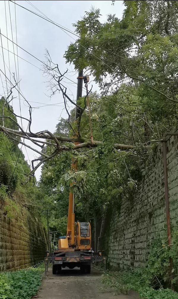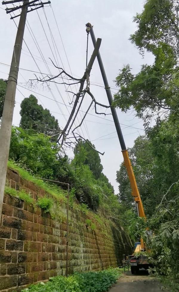 2020年8月28日晚,一場突如其來的狂風暴雨席卷資陽,導致城區多處樹木斷裂倒伏!29日一早,公司馬鞍山設備倉庫值守人員向公司機電設備處副處長張尚明報告,倉庫入庫道路右側堡坎上方公司宿舍區房屋外一顆大樹被風吹倒后橫壓在出庫的電力線路上,存在重大安全隱患。了解現場情況后,張尚明立即安排值守人員關閉出庫線路的電源,以防止電線被壓斷導致出現觸電事故,并同時趕往現場處置。