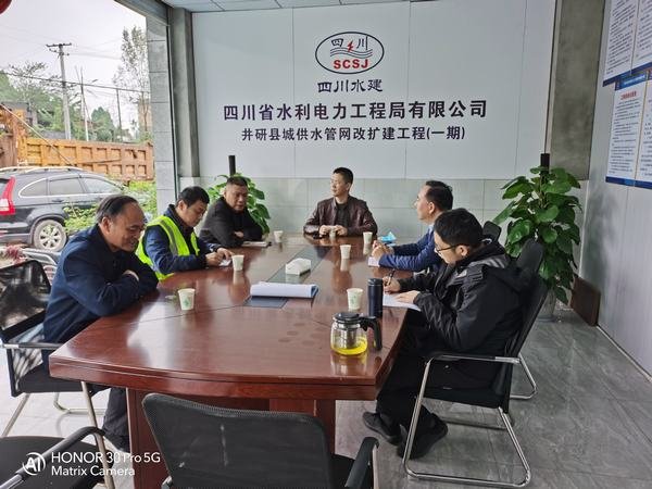 在第四分公司副經(jīng)理兼項目現(xiàn)場負責(zé)人唐劉軍、技術(shù)負責(zé)人張君寶的陪同下,尹曉東一行首先到工地現(xiàn)場查看了目前項目的施工進展情況。在項目部會議室,唐劉軍和井研縣興業(yè)供水公司常務(wù)副總經(jīng)理夏兵匯報了井研供水工程前期施工開展情況和目前施工進度,項目目前存在的征地協(xié)調(diào)、管材供應(yīng)問題及后續(xù)施工安排等情況。