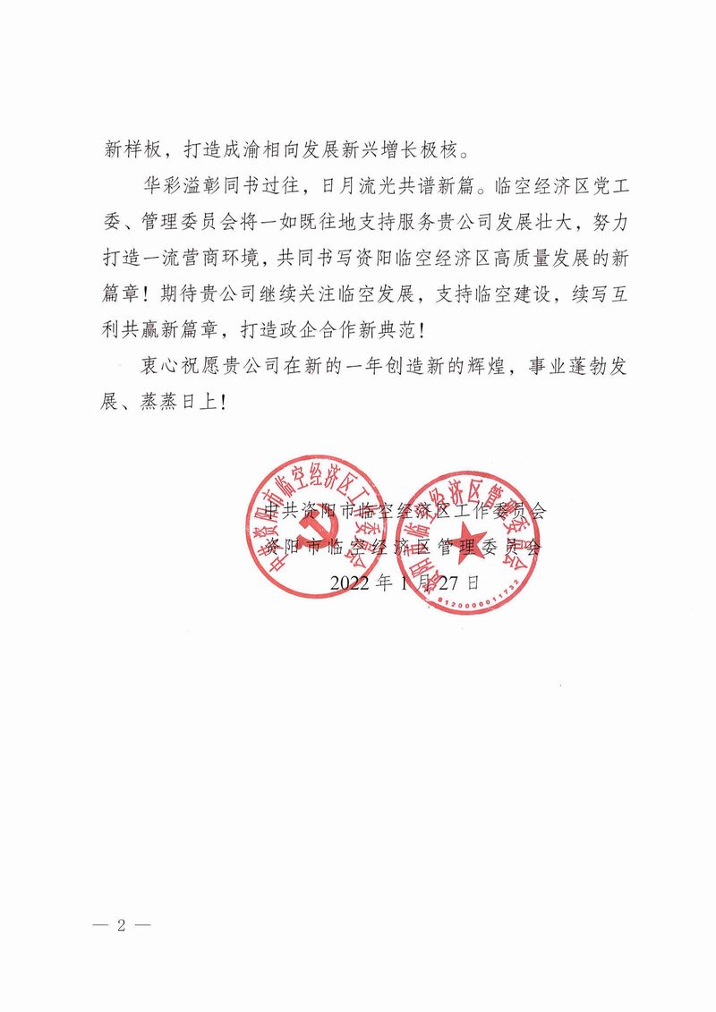 資陽市臨空經濟區管理委員會致公司感謝信