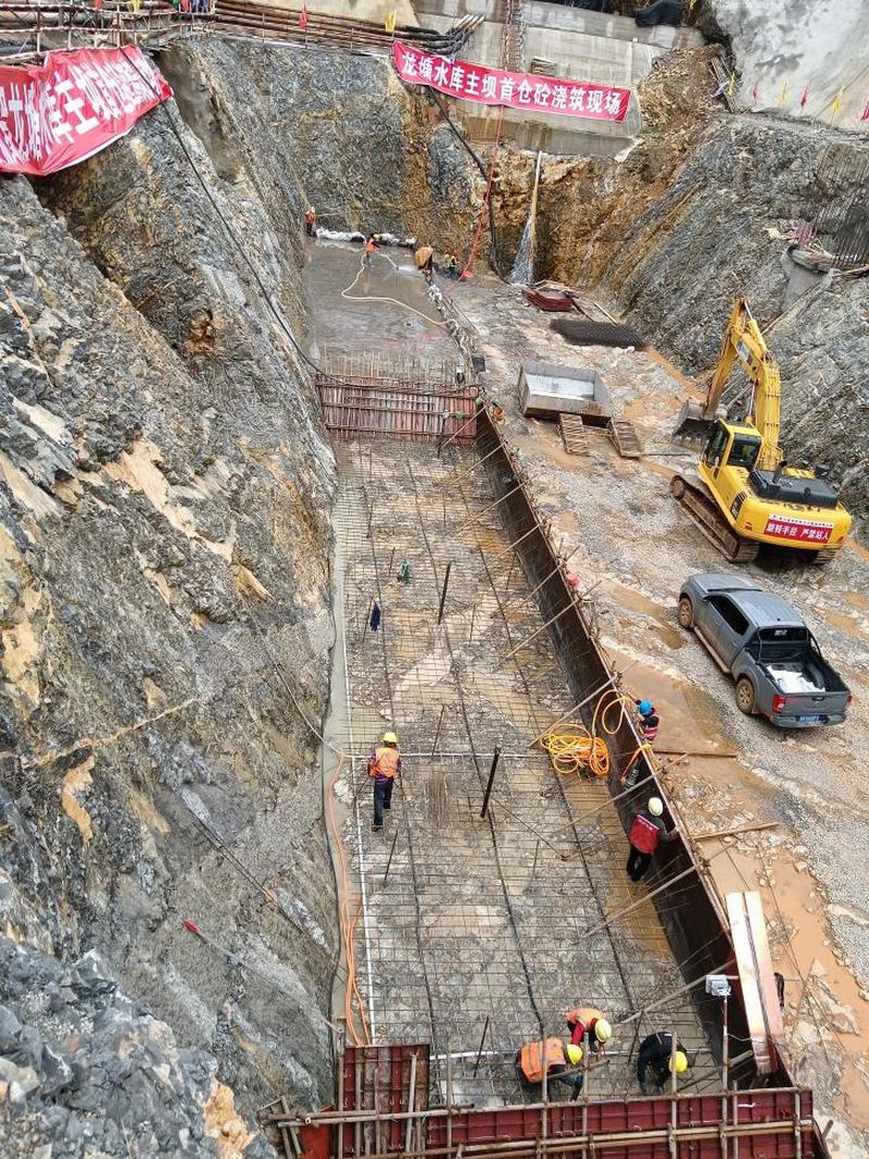 龍?zhí)了畮?kù)及灌區(qū)工程于2021年5月19日正式開(kāi)工,龍?zhí)另?xiàng)目部克服征地移民、動(dòng)力線路拆遷、炸藥手續(xù)審批、氣候條件差等問(wèn)題,在公司的堅(jiān)強(qiáng)領(lǐng)導(dǎo)下,在確保安全和工程質(zhì)量的前提下、龍?zhí)另?xiàng)目部全體職工通過(guò)不懈努力,按期完成了大壩壩基開(kāi)挖、副壩開(kāi)挖、圍堰填筑、滑坡體開(kāi)挖等施工項(xiàng)目,并于2022年7月20日順利實(shí)現(xiàn)大壩主壩首倉(cāng)混凝土澆筑。主壩首倉(cāng)混凝土的順利開(kāi)倉(cāng)澆筑,為順利完成龍?zhí)另?xiàng)目的年度目標(biāo)跨出了堅(jiān)實(shí)的一步。