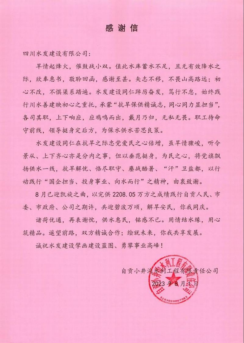 2023年5月公司參建小雙水庫抗旱應(yīng)急取水改造建設(shè)與運(yùn)行維護(hù)項(xiàng)目,是一項(xiàng)民生工程,自貢市受旱情影響,小井溝水庫和雙溪河水庫水位線接近庫底,水量明顯不足,不能保障自貢市和榮縣人民基本飲水需求。災(zāi)情就是命令,承建該項(xiàng)目的分公司上下同心積極組調(diào)人員、機(jī)械設(shè)備到現(xiàn)場,全體職工24小時(shí)輪班倒,克服一切難關(guān),切實(shí)解決好當(dāng)?shù)厝罕姷摹帮嬎y”問題,努力讓群眾喝上“放心水”“幸福水”。2023年8月,旱情得到了解除,為此,自貢小井溝水利工程有限責(zé)任公司對四川水發(fā)建設(shè)有限公司歷經(jīng)三個(gè)月辛苦奮戰(zhàn)表示感謝,感謝公司踐行“川水善建映初心”,發(fā)揚(yáng)水利鐵軍精神,展現(xiàn)國企擔(dān)當(dāng),踐行社會責(zé)任!