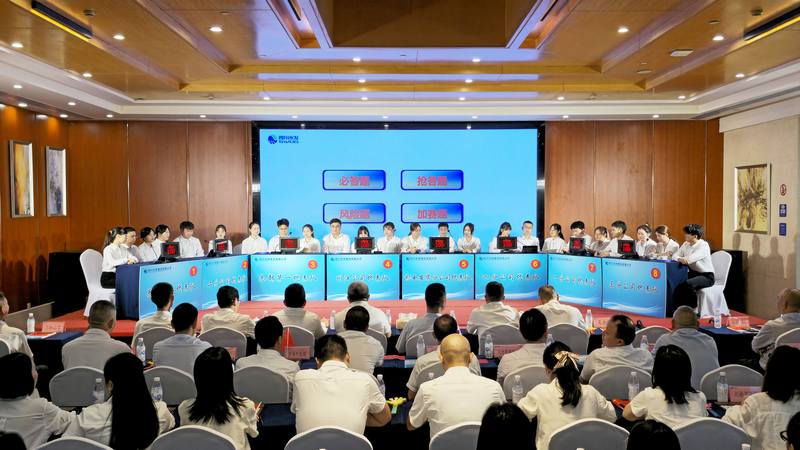 決賽現場,全體干部職工在雄壯豪邁的歌聲中齊唱《歌唱祖國》,隨著公司董事、總經理羅雪宣布開賽,決賽正式開啟激烈角逐。圍繞黨建宣傳、群團建設、決策治理、戰略管控、安全生產、職能管理和業務運行等方面,在“必答題--初露鋒芒”“搶答題--爭分奪秒”“風險題--共克險關”等環節,各組選手配合默契、反應迅速,以進取的精神、務實的作風精準判斷、踴躍答題;現場觀眾積極參加現場互動競答,充分展示了扎實的理論功底、豐富的知識儲備和良好的精神風貌。本次決賽共賽出一等獎1名,二等獎3名,三等獎4名。