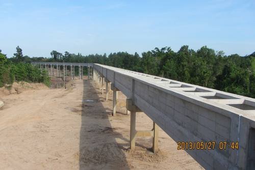 二枯期(2012.10~2013.6)是老撾色薩拉龍灌溉工程高峰期,是按期履約合同的關鍵節點。主要完成大壩左右岸壩段填筑到達到203米高程,超總計劃多填筑3米高程;溢洪道全部完工,達到完工驗收條件;取水口施工達到203米高程;引水渠主渠砼襯砌8182米,超額完成3682米,渡槽完成1號、2號、3號全部的砼澆筑,4號渡槽完成8個基礎及排架的砼澆筑。提前一個月達到二枯節點面貌,為順利完成老撾色薩拉龍灌溉工程施工任務打下了堅實的基礎。